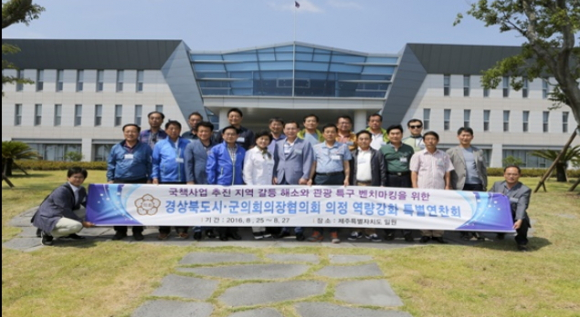 의장 협의회는 최근 한반도 사드배치 계획과 관련 중국과의 갈등으로 중국 관광객 감소와 경북지역의 갈등 분위기 극복을 위해 해군기지 건설 시 강정마을 주민과의 갈등해소 대책을 청취하고 의견을 나눴다. 이어 제주도청을 방문해 제주의 관광 인프라와 외국인 관광객 유치 사례 등을 벤치마킹하며, 경북의 새로운 관광콘텐츠 발굴과 활성화 방안을 모색하는 시간을 가졌다.