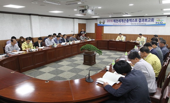 [예천] 예천군은 8월 31일 군청 영상회의실에서 2016예천세계곤충엑스포 추진결과와 개선방안에 대한 보고회를 가졌다. 이번 결과보고회는 엑스포 기간 중 각 부서별 소관 업무에 대한 성과와 문제점에 대한 개선방안을 마련하고자 개최됐다.