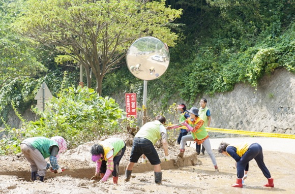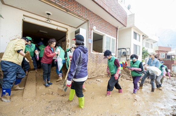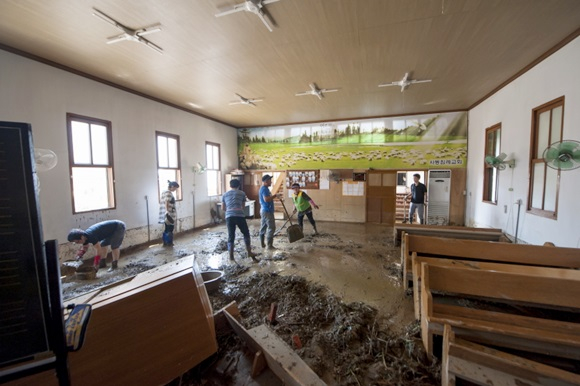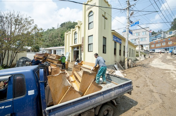 [울릉] 폭우가 휩쓸고 지나간 자리에 울릉도 봉사단체 회원들과 공무원들이 주택과 건물안에서 작업 중이다.