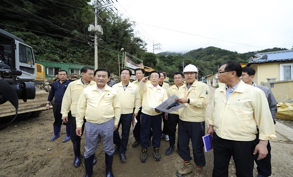 이곳에서 김지사는 “공사현장의 잘잘못은 뒤로 미루고 우선 복구비용과 주민구호대책을 시행하라고 지시하고, 공사관계자들에게는 추가피해가 발생하지 않도록 우수유입 차단을 완벽하게 하라”고 지시했다. 여러 곳의 피해현장을 둘러본 김지사는“민·관·군이 잘 협력해서 추석 전에 응급복구가 마무리 되어 주민생활에 불편이 최소화 될 수 있도록 해 달라”고 당부했다.