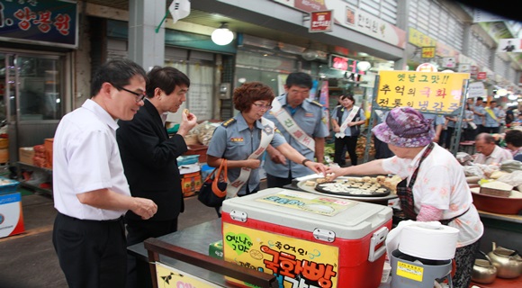 구미소방서, 의용소방대 등 60여명 참석한 이날 행사는 전통시장에서 물건사기 및 소방통로 확보 캠페인을 벌인 후 전통시장 온누리 상품권을 이용해 장보기와 먹거리 투어를 실시했다.
