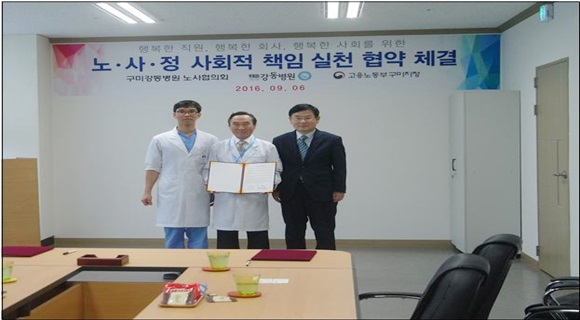 | [구미] 구미강동병원 노사는 9월 6일 구미고용노동지청과 함께 사회적 책임 실천 협약”을 체결했다. 이날 협약식에는 노사협의회 근로자대표 조현욱과 신재학 병원장, 박정웅 지청장 등이 참석했다.