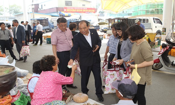 성주전통시장을 찾은 배재만 의장을 비롯한 전 의원은 의회사무과 직원들과 함께 최근 사드, 폭염 등으로 침체된 지역경제에 활력을 불어넣고 전통시장 활성화에 도움을 주기 위해 채소·과일가게 등에 들러 지역농산물을 구입하고 상인들의 애로사항을 청취했다.