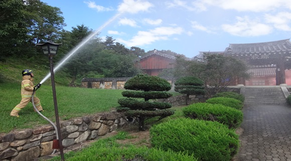 이번 훈련은 화재초기 관계인 화재진압훈련, 목조문화재 연소 시 소화·급수지원 방안 강구, 산불확대 시 진화선 확보 및 유관기관 합동진화훈련을 함께 실시했으며, 시나리오에 의한 실질적인 훈련이 되도록 진행됐다.