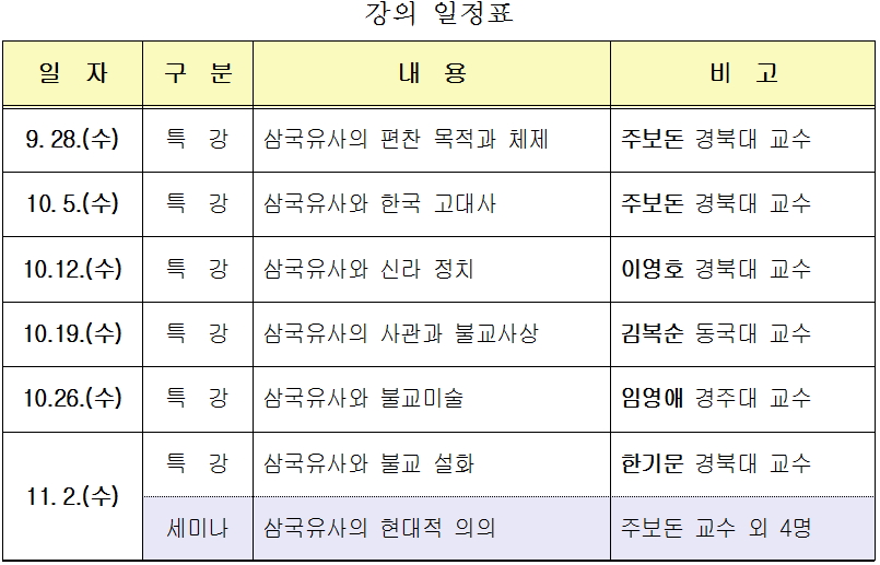 6주간 이어지는 삼국유사 특별강좌 및 세미나는 매주 수요일 14시에 1시간 동안 진행된다. 그리고 기간 중 11월 2일에는 ‘삼국유사의 현대적 의의’라는 주제로 삼국유사 세미나를 개최 삼국유사의 현주소를 살펴보고 향후 나아가야 할 방향 등에 대해 토론할 계획이다.