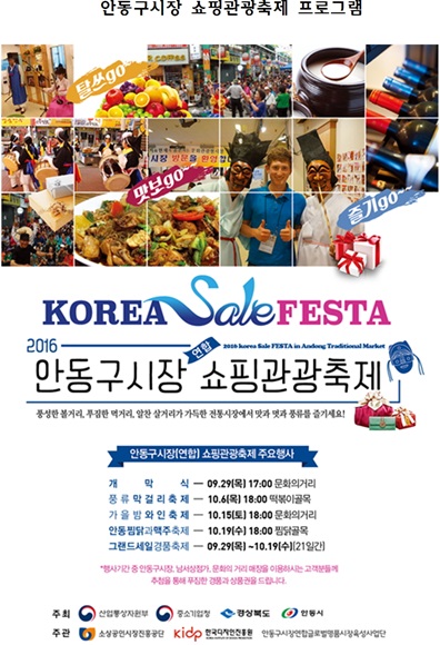 [안동] 대한민국 최대 쇼핑관광축제인 ‘2016 Korea-Sale FESTA 안동구시장 쇼핑관광축제’가 9월 29일부터 10월 19일까지 안동구시장, 중앙문화의 거리, 남서상점가 일대에서 열린다.