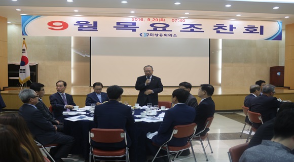 | [구미] 구미상공회의소는 9월 29일 2층 대강당에서 류한규 회장, 남유진 구미시장, 김영식 금오공대 총장, 이동걸 구미교육지원청교육장, 강동훈 구미세무서장, 박정웅 구미고용노동지청장, 조규찬 구미세관장, 이진우 구미소방서장, 차종범 구미전자정보기술원장을 비롯한 기관단체장, 도·시의원, 회원사 대표 및 임직원 등 200여명이 참석한 가운데 ‘9월 목요조찬회’를 개최했다.