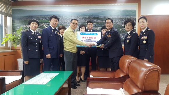 [경주] 경상북도 의용소방대 연합회는 9월 30일 경주시청 대외협력실에서 경주지진 피해돕기 성금 1,000만원을 전했다. 이 성금은 9월 12일 발생한 경주 지진과 관련하여 신속한 피해복구를 위하여 경상북도 의용소방대 전 대원이 십시일반 모금한 성금으로 전국재해구호협회를 통해 전달했다.