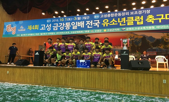 [고령] U-15 고령FC는 제4회 고성 금강통일배 전국 유소년 축구클럽 대회에서 준우승을 차지했다. 제4회 고성 금강통일배 전국 유소년 축구클럽 대회는 유소년 축구선수들의 심신단련과 기량 향상을 위해 지난 10월 1일 부터 3일까지 고성종합운동장 일원에서 펼쳐진 대회로 고령FC는 15명의 선수로 구성된 팀으로 출전했다. 이번 대회에서 고령FC는 예선전에서 2승 1패의 성적으로 준결승에 진출해 용인 레이번스팀과 0:0 무승부 뒤 승부차기로 결승에 진출했으며, 결승에서 인천J드림사커 팀과 1:1 무승부 뒤 연장전에서 1:2로 아깝게 패하며 준우승을 차지했다.