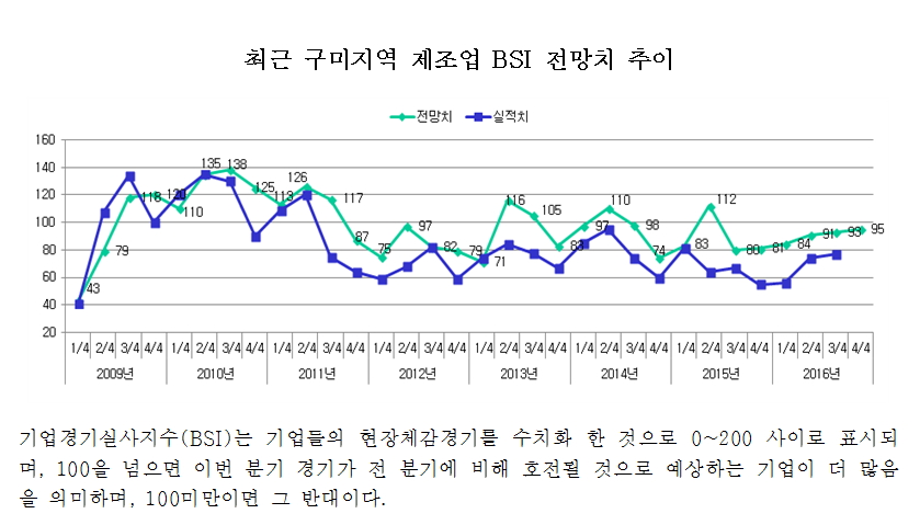 [구미] 구미상공회의소가 지난 8월 26일 ~ 9월 9일까지 지역 내 83개 제조업체를 대상으로 실시한 ‘2016년 4/4분기 기업경기전망 조사’에 따르면 BSI 전망치는 95로 나타나 기준치를 밑돌았지만 5분기 연속 상승했다. 즉, 2015년 3/4분기 80, 4/4분기 81, 2016년 1/4분기 84, 2/4분기 91, 3/4분기 93, 4/4분기 95로 소폭이지만 꾸준히 상승하고 있다.
