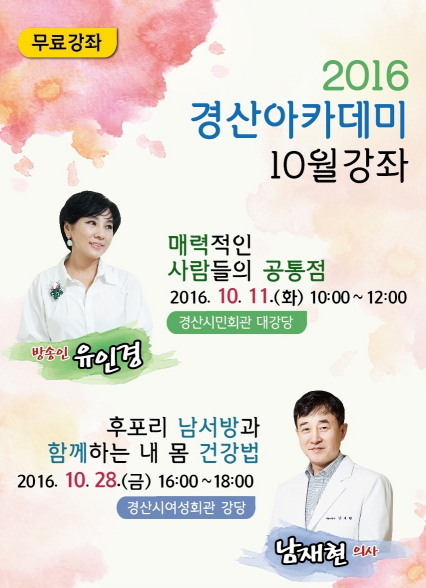 경산아카데미는 별도의 수강신청 없이 시민 누구나 참석 가능한 무료강좌로 금년도 마지막 강좌는 SBS 백년손님에서 후포리 남서방으로 활약 중인 의사 남재현 교수의 진행으로 오는 10월 28일 경산시여성회관에서 개최 될 계획이다. |