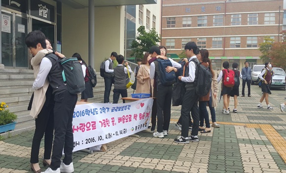[구미] 봉곡중학교는 2016학년도 2학기 교권보호주간(10월 4일 ~ 10월 14일)을 맞아 허그·하이파이브 데이 행사를 진행했다. 오전 7시 30분부터 시작된 이 행사에는 교장, 교감, 교사, 학생 등 1,000여 명이 참여했다.