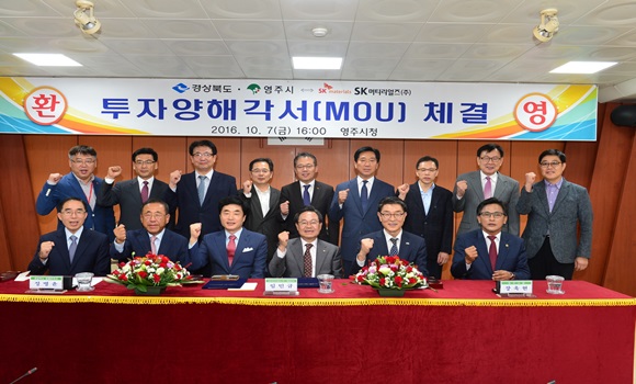 시는 지난 10월 7일 영주시청 제1회의실에서 정병윤 경상북도 경제부지사, 장욱현 영주시장, 임민규 SK머티리얼즈 대표이사와 관계자들이 참석한 가운데 육불화텅스텐(WF6) 공장증설에 관한 투자양해각서(MOU)를 체결했다.