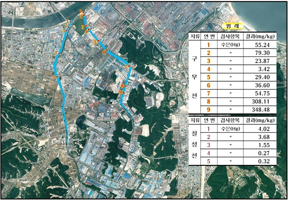 수은 검사 결과를 보면 다음과 같다. 송동2교(1.33±0.09), 연일대교(2.20±0.02), 섬안대교(44.0±1.52), 형산큰다리(48.3±0.84), 칠성천 유입부(17.0±0.48), 구무천 유입부(221.99 ± 0.42) (참고) 하천퇴적물 오염평가기준(수은) Ⅰ등급(0.07이하), Ⅱ등급(0.67이하), Ⅲ등급(2.14이하), Ⅳ등급(2.14초과)