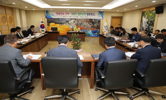 [성주] 성주군은 10월 13일부터 14일까지 2일간 군청 소회의실에서 실·과·단·소장과 담당이 참석한 가운데 ‘2017년 성주군정 업무보고회’를 가졌다. 업무보고는 기획감사실장의 2016년 총평보고에 이어 부서별로 2016년 신규 및 시책사업을 중심으로 이뤄졌으며, 특히 이번 보고회는 각 담당들의 업무능력 배양을 위해 담당이 소관업무에 대해 직접 보고하고 질의와 응답을 하는 방식으로 진행됐다.