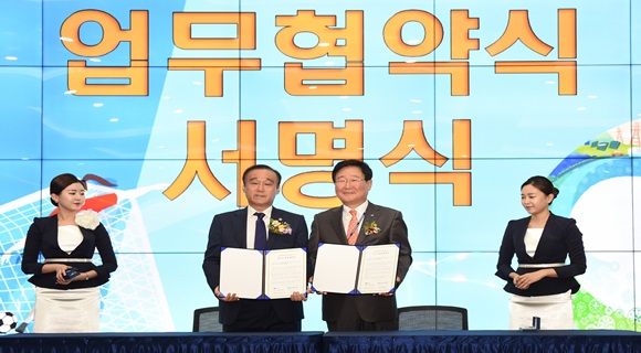 최양식 경주시장, 조석 한수원 사장 | [경주] 경주시와 한국수력원자력은 10월 17일 경주 한수원 본사에서 ‘한수원축구단 훈련센터 건립 및 여자축구단 연고지 업무협약’을 체결했다. 이날 행사에는 조석 한수원 사장, 최양식 경주시장, 오규상 한국여자축구연맹회장, 윤영선 경주시축구협회장 등 관계자 100여명이 참석했다.