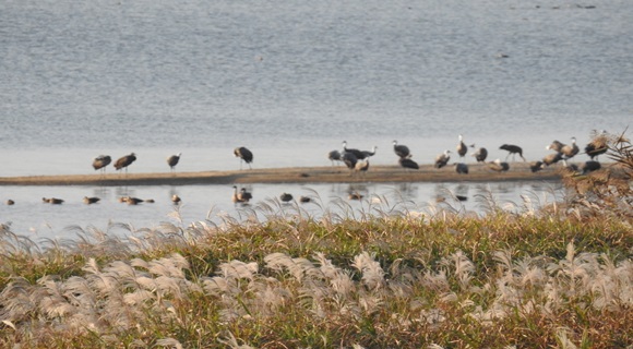 [구미] 낙동강 해평습지에 겨울진객 흑두루미 114마리가 올해 첫손님으로 찾아왔다.