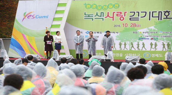 [구미] 구미시와 경상북도가 공동 주최하는 ‘환경보전실천 녹색사랑 걷기 대회’가 10월 28일 금오산 대주차장과 금오지(올레길)에서 남유진 구미시장, 조남월 경상북도환경산림자원국장, 김익수 구미시의회 의장을 비롯한 시·도의원, 지역기관단체장, 환경단체, 학생, 시민 등 1,500여명이 참석한 가운데 성황리에 개최했다.