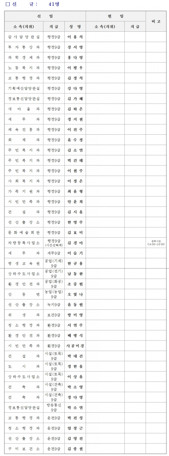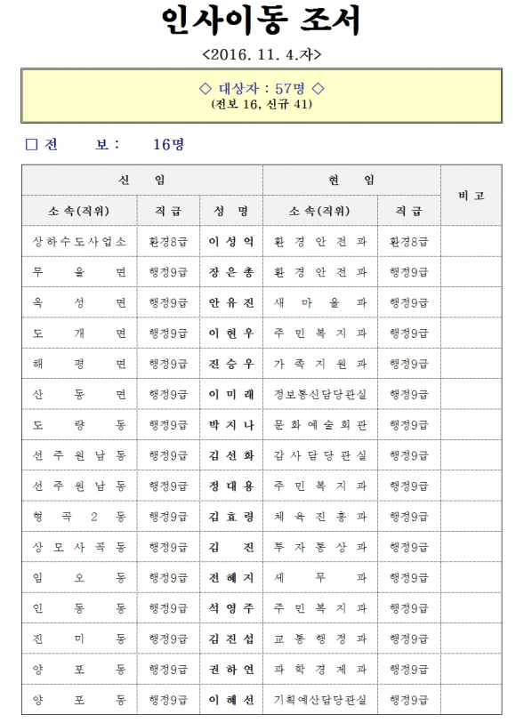 구미시는 11월 3일 57명 (전보 16, 신규 41)에 대한 인사이동 조서를 발표했다.