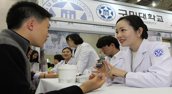 구미대 체험부스에는 비주얼게임컨텐츠과(캐릭터디자인), 작업치료과(비즈 팔찌 만들기), 피부미용테라피과(피부측정과 파라핀 팩), 간호학과(혈압 및 혈당체크) 등 4개 학과가 참여했다.