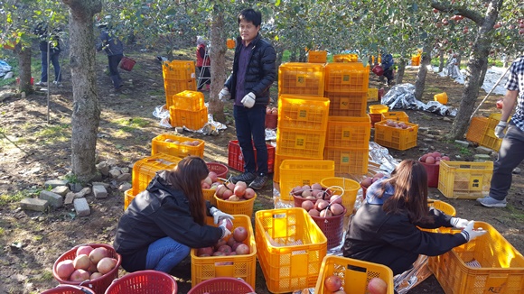 이날 현장에 모인 직원들은 부족한 노동력에 조금이라도 힘을 보태기 위해 사과수확에 다들 구슬땀을 흘렸다. 과수농가들은 이른 시간에도 불구하고 일손이 부족한 농가를 위해 도움을 준 직원들에게 감사의 뜻을 전했다.