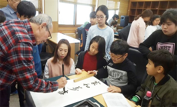 [의성] 의성군립도서관 서예반은 도서관 문화강좌교실에서 배우고 익힌 실력으로 지난 11월 2일 안계초등학교 4~5학년을 대상으로 ‘가훈 써주기’행사를 가졌다.