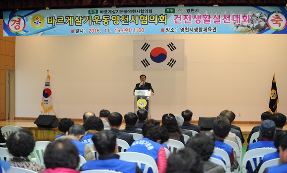 [영천] 바르게살기운동 영천시협의회는 지난 11월 16일 영천생활체육관에서 김영석 영천시장, 이만희 국회의원, 김순화 시의회의장과 읍면동 바르게살기회원 등 400여명이 참석한 가운데 2016 바르게살기운동 활성화 및 건전생활 실천대회를 개최했다.