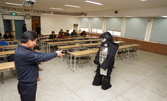 [김천] 김천경찰서는 11월 16일과 17일 양일간 4층 대청마루에서 4차에 걸쳐 전 경찰관을 대상으로 테이져건의 사용법과 주의사항, 수갑, 삼단봉 등 올바른 장구 사용 교육을 실시했다.