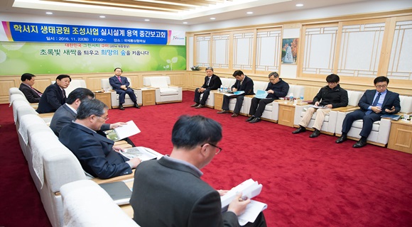 [구미] 구미시는 산동 학서지 생태공원 조성사업의 원활한 추진을 위해 현재 진행중인 설계용역 중간보고회를 11월 22일 구미시청 국제통상협력실에서 개최했다. 학서지 생태공원 조성사업은 사업비 160억원을 투입해 생태탐방로, 생태체험장, 휴게시설 등을 설치할 계획이며, 2020년 준공을 목표로 하고 있다.