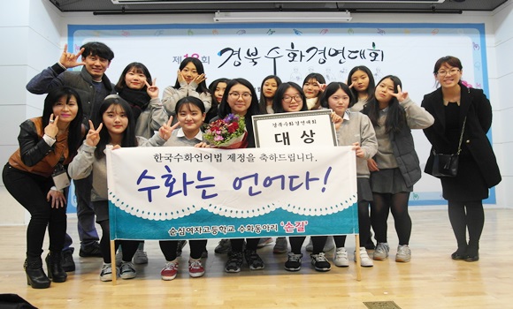 [칠곡] 순심여자고등학교(교장 김주태)는 11월 19일 (사)한국농아인협회 경상북도협회에서 주최하고 칠곡문화원 대강당에서 열린 제18회 경북수화경연대회에서 ‘손길’ 동아리 학생들이 ‘촛불 하나’라는 노래를 모티브로 창작한 농아인의 일상생활을 담은 뮤지컬을 연극과 수화로 아름답게 표현해 대상을 수상했다.