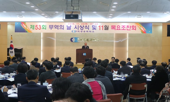 [구미] 구미상공회의소는 11월 24일 2층 대강당에서 류한규 회장, 남유진 시장, 김익수 구미시의회 의장, 김대현 구미경찰서장, 강동훈 구미세무서장, 이동걸 구미교육지원청교육장, 박정웅 구미고용노동지청장, 조규찬 구미세관장, 이진우 구미소방서장, 권기용 한국산업단지공단 대경지역본부장을 비롯한 기관·단체장, 도·시의원, 회원사 대표 및 임직원 등 220여명이 참석한 가운데 ‘제53회 무역의 날 시상식 및 11월 목요조찬회’를 개최했다.