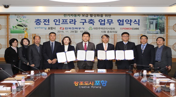 [포항] 포항시는 11월 28일 포항시청 중회의실에서 한국전력공사 포항지사, 대한주택관리사협회 포항지부, ㈜파워큐브와 전기차 보급 활성화를 위한 충전인프라 구축 업무 협약을 체결했다.