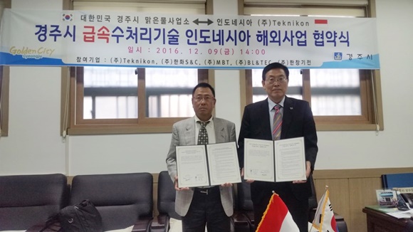 일루완 ㈜테크니콘 대표, 김문호 경주시 맑은물사업소장 | [경주] 경주시의 수 처리 특허공법이 해외 진출을 눈앞에 두고 있다. 경주시 맑은물사업소와 인도네시아 수 처리기업인 ㈜테크니콘은 12월 9일 맑은물사업소에서 급속 수 처리기술 인도네시아 해외사업 추진을 위해 양해각서(MOU)를 체결했다.