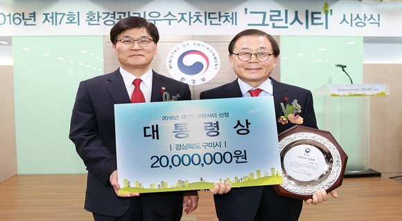 구미시는 이날 영예의 대통령상을 수상해 대구·경북권역 최초로 전국 1위 그린시티(Green City)에 선정되는 영광을 차지했다. 그간 1위인 대통령상에는 순천, 제주, 춘천 등 청정도시로 잘 알려진 곳들이 선정됐으나, 올해는 그간의 노력을 인정받아 산업도시인 구미가 그린시티로 선정돼 그 의미가 더욱 컸다.