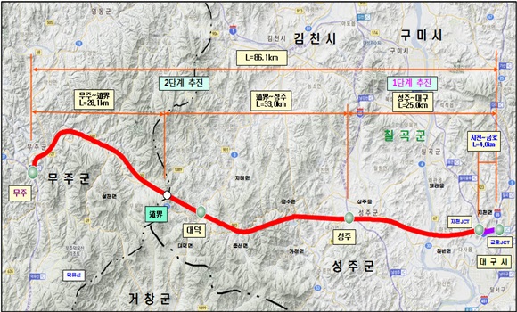 무주~대구 구간을 살펴보면 총연장 86.1km에 3조 200억 원이 소요된다. 세부내용은 무주에서 성주 까지는 61.1km에 2조3천억 원이 소요되며, 성주에서 대구까지는 25km에 7천 200억 원이 소요 될 것으로 보인다.