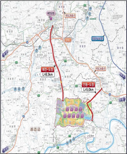도청신도시 진입도로는 상위 국가기간 교통망과 연계교통 구축을 위해 총 8개 노선, 73.34㎞에 1조 2,634억 원을 투입되는 사업으로, 우선적으로 총사업비 1,871억 원을 투입해 안동과 예천방면 2개 노선에 대한 진입도로 개설사업을 완료했다.