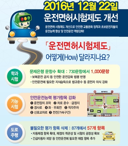 학과시험은 최근 이슈가 되고 있는 보복운전 금지, 긴급자동차 양보 등 내용이 추가됐다. 항목도 730문항에서 1000문항으로 늘어났다. 도로주행시험은 전체 87개 항목 중에서 일부 항목을 빼고 안전운전에 꼭 필요한 항목을 추가해 총 57개로 간소화된다.