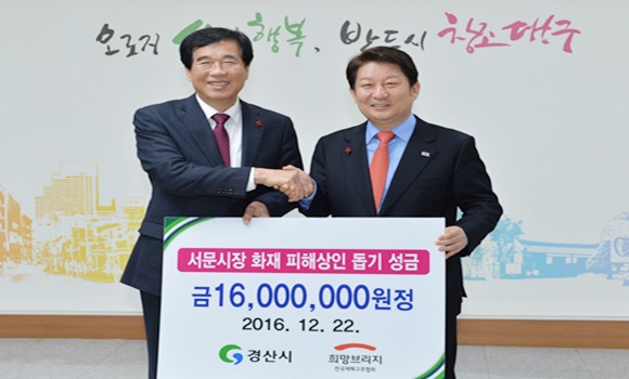 [경산] 경산시는 12월 22일 대구시청을 방문, 서문시장 화재로 피해를 입은 상인들을 돕기 위해 직원들의 마음을 십시일반으로 담은 성금 1,600만원을 전달했다.