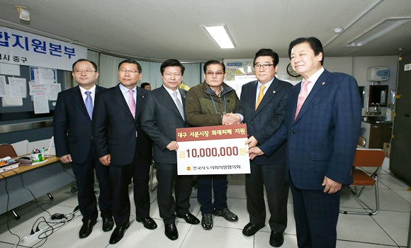 경상북도의회 김응규 의장과 충남도의회 윤석우 의장, 류규하 대구광역시의회 의장, 이은방 광주광역시의회 의장, 윤시철 울산시의회 의장등 전국시도의회 의장단은 12월 23일 대구서문시장 화재피해현장을 방문해 상인들을 위로하고 복구지원금을 전달했다.