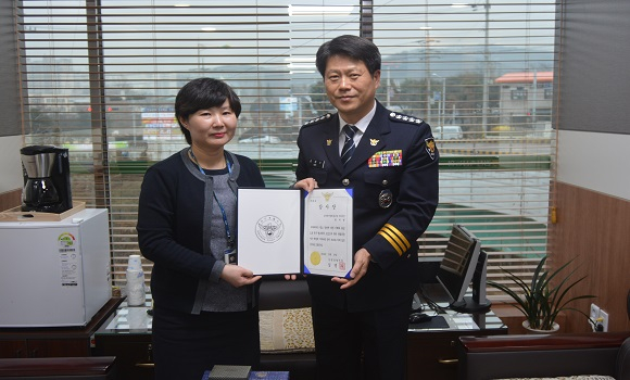 [김천] 김천경찰서 김영수 김천경찰서장은 12월 19일 축협은행을 방문해 전화금융사기를 사전 예방한데 기여한 축협은행 여직원에게 감사장을 수여했다.