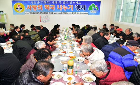 고윤환 문경시장은 “바르게 여성회에서 추운날씨임에도 불구하고 이웃간의 따뜻한 정을 나누기 위해 사랑의 떡국을 준비 해 주셔서 감사드리며, 정유년 새해에도 건강하고 행복하시기를 기원 한다.”는 덕담을 전했다.