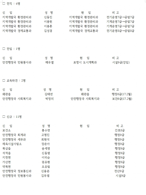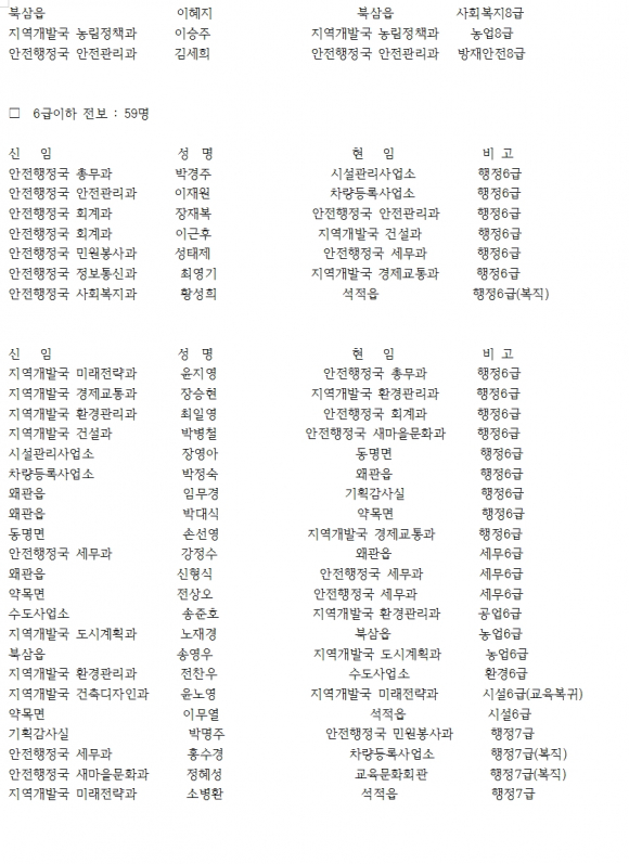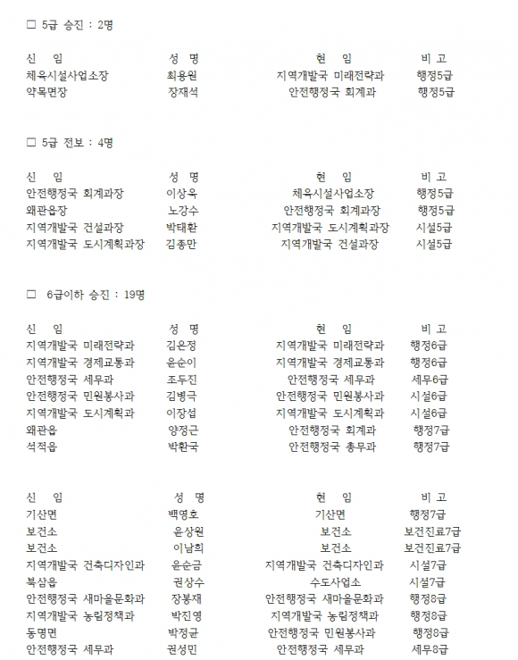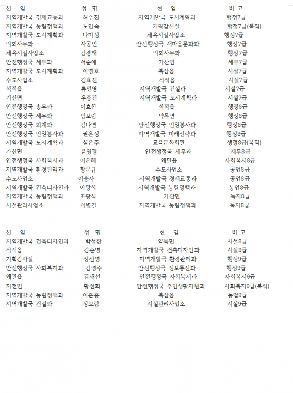 [칠곡] 칠곡군은 29일, 1월 1일자 인사이동 명단을 발표했다. 인사대상자는 총102명이다.