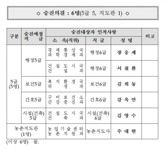 [구미] 구미시는 12월 29일 승진의결자 명단을 다음과 같이 발표했다.