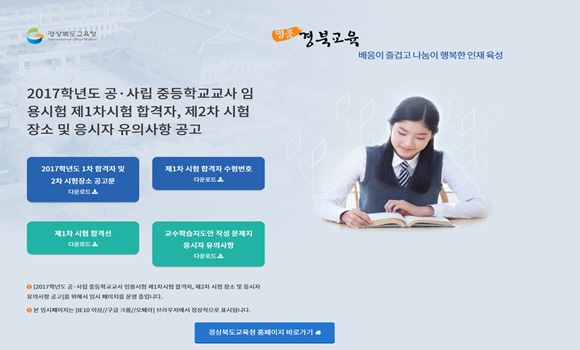 [경북] 경상북도교육청은 1월 3일‘2017학년도 경상북도 공·사립 중등교사 임용후보자 선정경쟁시험(제1차) 합격자 발표 및 제2차 시험장소’를 교육청 홈페이지를 통해 공고했다.