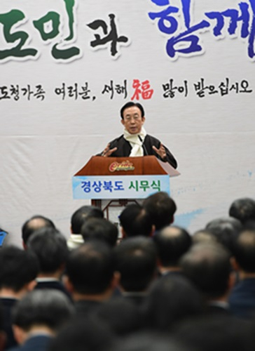 청사를 안동으로 이전한 후 처음으로 열리는 시무식으로 지난해 도청이전에 따라 개인적으로 살림살이를 이사하는 등 분주했던 가운데 일구어낸 도정 성과를 바탕으로, 올해 정유년에는 조금 더 도민에게 다가가는 도정을 펼치겠다는 굳은 결의를 엿볼 수 있었다.