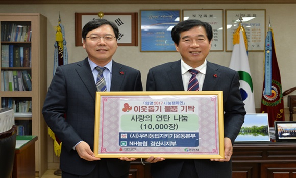 최영조 경산시장은 “어려운 이웃들을 위해 지속적인 도움을 주신 (사)우리농업지키기운동본부 경북지역본부와 NH농협 경산시지부에 깊은 감사의 인사를 전하며, 앞으로도 우리시 농업 발전을 위해 많은 협조를 부탁한다.”고 말했다. |