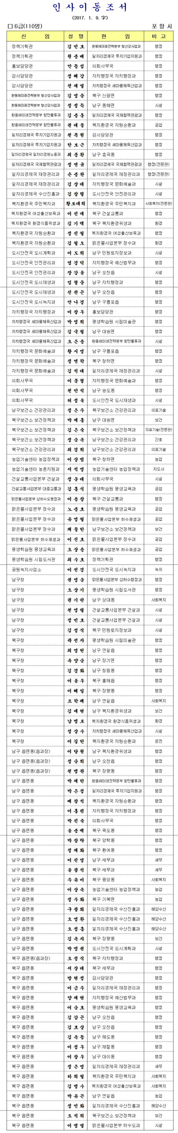 포항시, 1월 5일자 6급 인사이동조서 발표