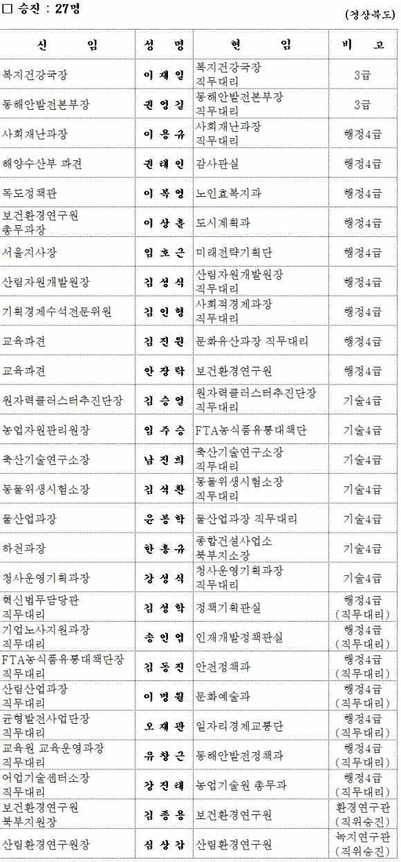 한편, 경북도는 지난 1일 실원국장 및 부단체장, 9일 과장급 인사를 완료한데 이어, 각종 민생현안을 해결하기 위해 조기에 5급 이하 직원에 대한 인사도 마무리할 예정이라고 밝혔다.
