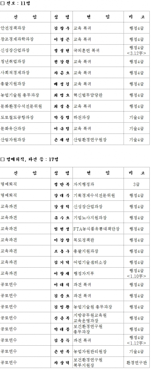 이번 인사로 2명이 부이사관으로 직급승진하고, 과장 직무대리자 포함 16명이 서기관으로 직급승진, 9명이 새롭게 과장 보직을 맡게 됐다.