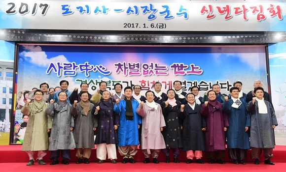 [경북] 2017년 새해를 맞아 김관용 도지사와 23개 시장·군수가 한자리에 모였다. 도청이전 후 처음으로 맞는 새해의 의미를 되새기고 대통령 탄핵소추 사태에 따른 국정혼란과 경기침체, 조류인플루엔자(AI) 등으로 어려움을 겪고 있는 도민들을 위해 도와 시·군이 힘을 모아 적극적으로 민생을 챙기자는 의지를 다지기 위해서다.